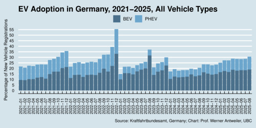 Budget pressures let to an abrupt end of EV subsidies at the end of 2023. Germany's constitutional court had ruled on a 60-billion fund earmarked for climate transformation project was an unconstitutional relabeling of funds that were raised under a special provision for exceeding the federal debt ceiling, Germany's infamous Schuldenbremse. Overnight, EV subsidies were history, and EV sales dropped in half from December 2023 to January 2024. Since then, EV sales have recovered little by little and have surpassed 30% again in August 2025. The EV transition is gathering momentum in Germany all on its own.