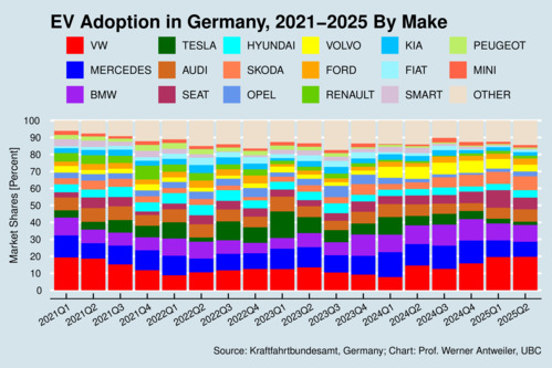 EVs have come of age in Germany. EV sales are moving forward even without subsidies. And this has not spelled the end of car manufacturing in Germany, despite fierce international competition. The next chart shows the composition of vehicle sales, quarter by quarter, by major brands.
