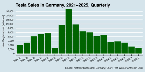 But what happened to Tesla, the EV manufacturer that is so visible in North America? Tesla even opened a plant in Germany, known as the Gigafactory Berlin-Brandenburg, in March 2022. It produces Tesla's Model Y. The plant also manufactures batteries and was designed for a production capacity of 500,000 vehicles annually. The plant supplies many European countries. However, Tesla is not doing well in Germany, as the chart below shows. The trajectory looks catastrophic: in the second quarter of 2025, Tesla sold barely over 1,000 vehicles per month in Germany.