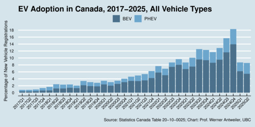 Returning to Canada's EV adoption, the chart below shows a similar drastic reaction as Germany experienced at the beginning of 2024. EV sales were cut in half, with the overall rate dropping from about 18% in the last quarter of 2024 to about 9% in the first quarter of 2025. But as the chart from Germany reveals, there is a ray of hope for a recovery even without subsidies.