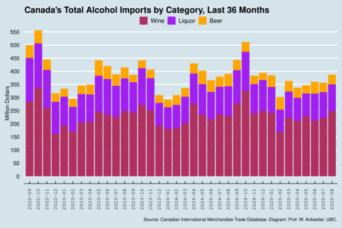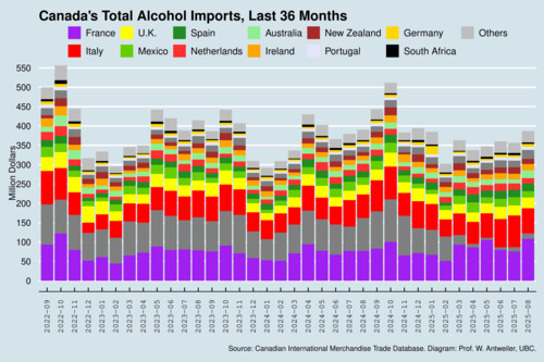 I estimate that monthly imports from the U.S. have declined by about 69.6 million dollars between March and August of 2025. The countries that have gained the most are France (+$13.9mio) and Italy (+$8.4mio). Spain, New Zealand, Chile, and Ireland all gained about 3 million dollars. French and Italian vintners will be happy. Perhaps Canadians will relieve their sorrows about the economic impact of the trade war with an extra glass of Chianti from Tuscany or a Chardonnay from Burgundy.