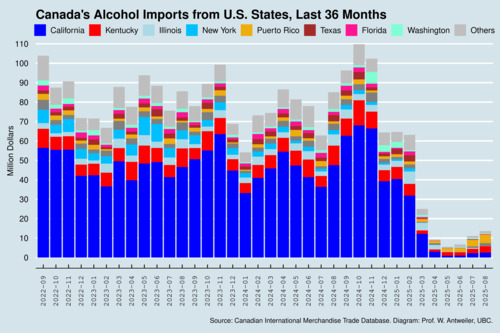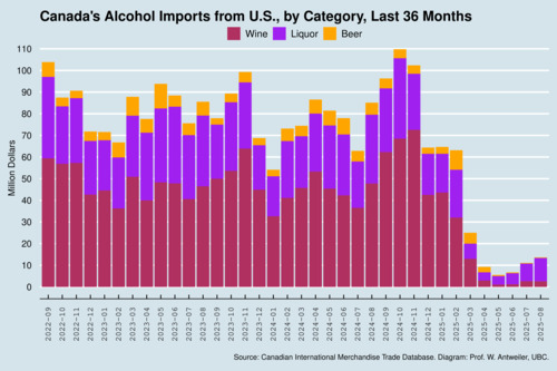 As a trade economist, I have been pouring over numerous charts every month tracking the effect of the trade war, focusing mostly on the harm caused by U.S. tariffs on Canadian exports. Canada's retaliation has been most noticeable with respect to alcohol imports as these imports are largely administered by provincial liquor control boards. Four charts below show where things have ended up by the end of summer.