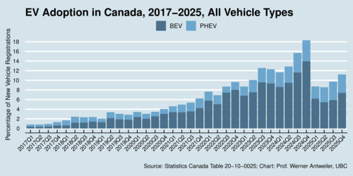 After purchase incentives were cut in early 2025, EV adoption rates in Canada have plummeted. During the last quarter of 2024, an average of just over 18% of new vehicles sold in Canada were either battery-electric vehicles (BEVs) or plug-in hybrid electric vehicles (PHEVs). As the chart below shows, by the last quarter of 2025, sales have started picking up again but are still about 7%-points below where they were in 2024.
